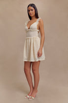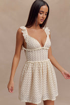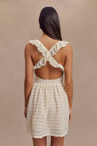 The EZRA Lace Mini Dress exudes femininity with a modern twist. Featuring a delicate V neckline and cross-back straps adorned with frill detail, this dress effortlessly blends femininity and sophistication. The fitted bodice enhances your silhouette, while the voluminous skirt creates a captivating contrast that adds movement and flair. Crafted from exquisite lace, the mini-length design is perfect for special occasions, where timeless elegance meets playful charm.