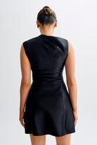 The GRANGER Satin Structured Mini Dress is a striking piece that combines modern design with timeless elegance. Featuring an asymmetrical gathered neckline and wide shoulders, this sleeveless dress makes a bold statement. Its structured, A-line silhouette offers a flattering fit, while the mini length adds a touch of playfulness. Fully lined for comfort, and equipped with a side zip for easy wear, this satin dress is perfect for any special occasion where you want to stand out.