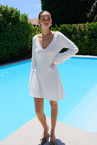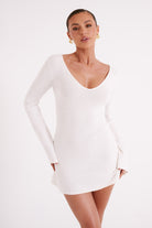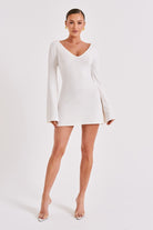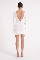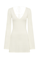 The JAYDA is a long-sleeved mini dress with a deep V-shaped neckline and self-tie fabric straps at the back. Both the sleeves and skirt hem feature a flared fit to complement the stretchy knit body-con fabrication. The back is low and open, with self-tie fabric straps that lie across the opening. The form-fitting, unlined material paired with the lack of a visible closure creates a smooth, seamless silhouette that emphasises the dress’s simple elegance.