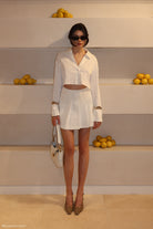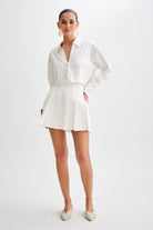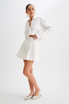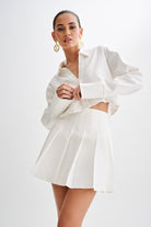 Behold the JULIANNA Cotton Pleated Mini Skirt, a stylish addition to your wardrobe essentials. Crafted from premium cotton, this skirt features a flattering high-waisted design that accentuates your figure. The side zip ensures effortless wear, while the knife pleats add a touch of sophistication and fluidity to the silhouette. Its mini length makes it versatile for various occasions, allowing you to dress it up with the Julianna Cotton Button Up Shirt and heels or down with a casual top and sneakers. With its timeless appeal and effortless charm, the Julianna Cotton Pleated Mini Skirt is sure to become a go-to piece for any ensemble.
