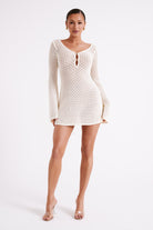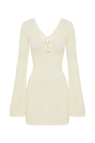 The KAYLEIGH is a knit mini dress, designed in a vintage-inspired crochet fabrication. Crafted with long bell sleeves and balanced with a mid-low back, it’s a piece made for easy styling during the day and dressing up with heels in the evening. Pair with the Zadie Double Teardrop Earrings to elevate your look.