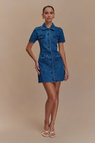 Introducing the LEIGHTON Denim Button Down Mini Dress, a versatile and stylish addition to your casual wardrobe. This dress features a classic collared neckline and a button front closure, effortlessly blending timeless design with modern flair. The short sleeves add a feminine touch, making it ideal for warm-weather outings. The playful mini length makes it perfect for pairing with your favourite footwear, from heels to sandals. With non-functional pockets adding a chic detail without compromising the sleek silhouette, this dress is your go-to for both relaxed weekends and vibrant nights out.