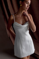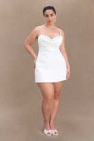 The LILIANE Suiting Mini Dress is a bold fusion of structure and femininity. Featuring pearl-adorned bust cups and delicate pearl straps, this dress brings a refined, yet striking touch to classic tailoring. The gathered bust overlay softens the look, while the fitted waist and structured mini skirt create a sculpted silhouette. A pearl hem detail adds a hint of luxury, elevating the design with subtle embellishment. Fully lined for a seamless fit and finished with a back zip closure, the Liliane dress is the ultimate choice for evening elegance, statement moments, and after-dark sophistication.
