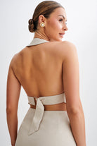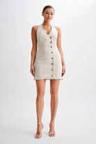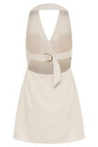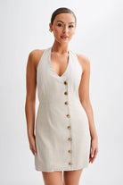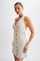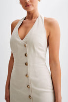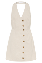 The LORRAINE mini dress crafted from a soft linen fabrication. It features a halter fit that beautifully frames your shoulders, while the deep V neckline leads into a functional centre front button closure. Vintage-inspired with a contemporary twist the functional back belt allows you to cinch the waist for a customised fit. Pair with the Dasha Sling Back Heel to complete the look.
