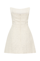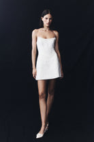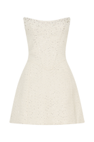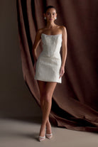 The LORRIE Tweed Corset Mini Dress is a stunning fusion of classic sophistication and modern allure. Featuring a strapless scooped neckline, this dress highlights the décolletage with elegance, while intricate hand-beaded detailing adds a touch of luxury. The corseted bodice, complete with boning and an internal waist stay, sculpts and supports for a flawless fit. Crafted from shimmering sequin tweed, the structured mini skirt balances refined tailoring with a bold, fashion-forward edge. Fully lined for comfort and finished with a back zip and hook-and-eye closure, the Lorrie dress is the perfect statement piece for glamorous evenings, celebratory moments, and unforgettable nights.