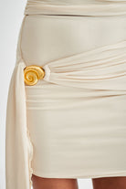 Elevate your wardrobe with the MAGGIE Slinky Mini Skirt, a symbol of effortless elegance. This high-waisted skirt features striking front shell hardware and intricate gathered panel detailing complemented by a delicate sash. Its mini length adds a touch of flirtatious charm while maintaining a sophisticated silhouette. Lined for comfort and a flawless fit, this skirt seamlessly transitions from day to evening. Pair with the Winslet Strapless Slinky Longline Top With Shell Hardware to complete the look.