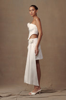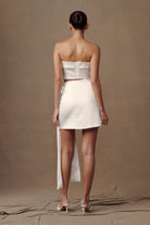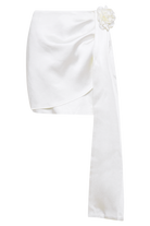 Introducing the MARGOT Rose Mini Skirt, a symbol of modern femininity and elegance. Designed with a flattering mid-rise waist and an A-line shape, this skirt accentuates your silhouette with effortless grace. Lined for comfort and featuring an invisible side zip for easy wear, it combines practicality with style. The side ruching detail adds a touch of texture and dimension, while the sash attachment at the hip offers versatility and charm. Adorned with delicate applique flower detail at the hip, the Margot skirt is a captivating piece that adds a romantic flair to any outfit. Complete the look with the Margot Strapless Rose Corset.