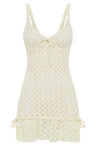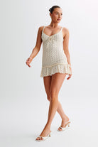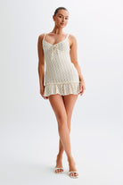 Embrace elegance with the MARIETTA Cupped Lace Mini Dress, designed with flattering bust cups and adjustable straps for a customised fit. Featuring an A-line skirt, this dress exudes feminine charm and grace. Unlined and knitted, it offers comfort and style, perfect for any occasion. Complete with frill and bow detailing, the Marietta dress adds a playful touch to your ensemble.