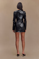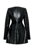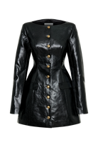 Make a striking statement with the NANCY Faux Leather Mini Dress, a perfect blend of edgy style and sophisticated design. Featuring a chic boat neckline that elegantly frames your décolletage, structured shoulders add a bold, confident touch. The long sleeves provide a sleek contrast to the mini length, making it ideal for any occasion. With a central front button closure, this dress offers a polished finish, while the structured skirt shape creates a flattering silhouette that accentuates your figure. Non-functional pockets enhance the modern aesthetic without sacrificing style.