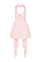 The ORELLIA Strapless Suiting Mini Dress is the perfect blend of sophistication and contemporary bridal charm. Designed with a striking deep plunge neckline and a fitted bodice, this dress flatters with structured tailoring while exuding effortless grace. The sculpted mini skirt creates a sleek, refined silhouette, accented by a statement front bow for a touch of romantic whimsy. A detachable chiffon scarf drapes beautifully, adding soft movement and ethereal elegance. Finished with a back zip for a flawless fit, this dress is a stunning choice for bridal showers, rehearsal dinners, or modern brides looking for a bold yet timeless statement.