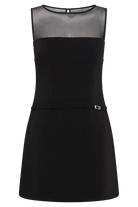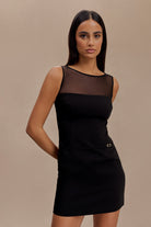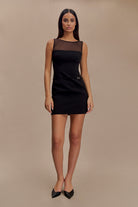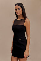 The POSIE Suiting Belted Mini Dress combines sophistication with a touch of playful charm. Featuring a boat neckline and a mesh upper that adds a hint of allure, this dress is designed with a fitted bodice that enhances your silhouette. The mini length and A-line skirt create a flattering, feminine shape, while the belt detail at the high hip adds a stylish accent. With a back keyhole, button, and zip closure for a secure fit and a lined interior for comfort, the Posie Dress is perfect for making a statement at any event.