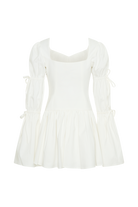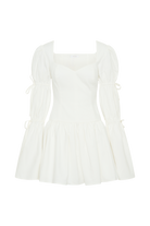 Embrace a blend of playful charm and sophisticated style with the Raine Long Sleeve Cotton Mini Dress. Featuring a flattering princess neckline, this dress is designed to accentuate your figure with a fitted bodice that provides a sleek silhouette. The ruched sleeves, adorned with strap tie detailing, add a unique touch, creating an eye-catching element that elevates the overall design. A gathered lower skirt flows gracefully, offering a playful yet elegant vibe. The mini length makes it perfect for showing off your favourite footwear. Complete with a side zip closure and fully lined for comfort, this dress is ideal for any occasion, ensuring you look chic and feel fabulous.
