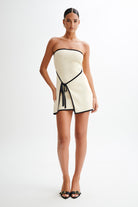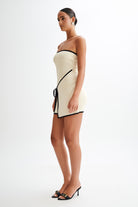 The RIAN Strapless Knit Mini Dress is a bold and stylish choice that captures a youthful and energetic vibe, perfect for evenings out or casual summer days. This strapless design showcases a clean and simple neckline that emphasises the shoulders and collarbone, making it a flirty and fashionable statement piece. The dress features contrast lined edges that add a sharp, modern touch to its overall appearance. An asymmetrical overlay provides a unique textural element and visual interest, while the functional hip tie allows for a customisable fit, adding both style and practicality. Crafted in a mini length, this unlined dress is ideal for those who love to showcase their legs and enjoy the freedom of a lightweight, breezy garment. The Rian Dress blends comfort with contemporary fashion, making it a must-have for any trend-setting wardrobe.