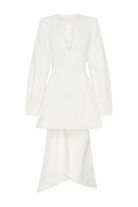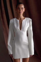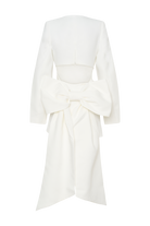 The ROSANNA Suiting Bow Mini Dress is the perfect balance of sharp tailoring and feminine elegance. Designed with a striking deep plunge neckline and structured internal shoulder pads, this dress commands attention. The fitted waist creates a sleek silhouette, while the open back adds a daring touch. A statement bow detail at the back enhances the mini-length design with a dose of sophistication. Fully lined for a polished finish, the Rosanna dress is a bold choice for evening events, cocktail parties, and unforgettable entrances.