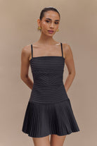 Step into a world of elegance with the RYLEE Multi Pleat Mini Dress, designed to elevate your wardrobe with its charming details. This dress features adjustable straps for a perfect fit and a tie and zip back closure for added security. The fitted bodice beautifully accentuates your figure, while the pleated panelling introduces a sophisticated texture. The gathered lower skirt flows effortlessly, making this mini-length dress perfect for twirling at parties or enjoying a day out. Fully lined for comfort, this dress is the ideal choice for those who want to blend style and grace seamlessly.