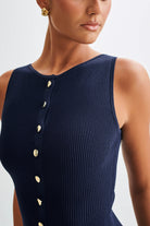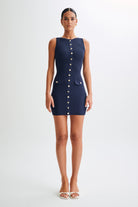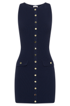 The SAWYER Knit Mini Dress is a chic and versatile piece perfect for any occasion. Featuring a classic round neckline and a sleeveless design, this dress showcases a center front button closure with eye-catching gold buttons. The straight skirt shape and front mock pockets add a touch of sophistication, while the unlined knit fabrication ensures comfort and breathability. With its mini length, this dress is both stylish and practical, making it a must-have addition to your wardrobe.