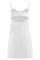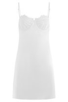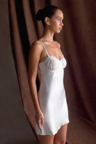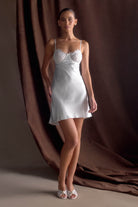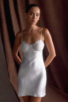 The SCARLETT Satin Slip Mini Dress is the perfect balance of allure and elegance. Featuring delicate lace bust cups with underwire support and mesh lining, this mini dress offers a structured yet feminine fit. The scalloped neckline edging adds a touch of romance, while adjustable straps and an open-back design enhance its sultry appeal. Crafted in a flattering A-line silhouette and finished with a hook-and-eye back closure, this dress is unlined for a lightweight, effortless feel—ideal for date nights, special occasions, or modern bridal moments.