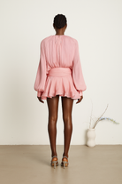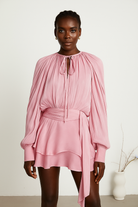 Playful yet polished, the Twilight Ruffle Mini Dress features a twist-front waist, long sleeves with buttoned cuffs, and a chic neck tie. Finished with subtle glitter accents and a ruffled hem, this semi-sheer style brings elegant movement and sparkle to every soirée.