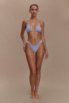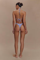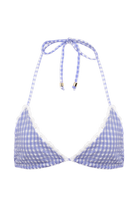 The Persephone Gingham Triangle Bikini Top combines classic design with playful details. Featuring a halter neckline and triangle shape, this top is accented with delicate lace trim for a touch of femininity. Adjustable ties ensure a custom fit, while the textured gingham fabrication adds a charming, vintage-inspired finish. Pair it with the Persephone Gingham Bikini Bottoms for a perfectly coordinated swimwear set.
