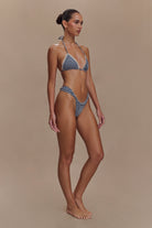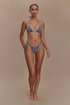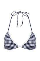 The Persephone Gingham Triangle Bikini Top combines classic design with playful details. Featuring a halter neckline and triangle shape, this top is accented with delicate lace trim for a touch of femininity. Adjustable ties ensure a custom fit, while the textured gingham fabrication adds a charming, vintage-inspired finish. Pair it with the Persephone Gingham Bikini Bottoms for a perfectly coordinated swimwear set.