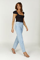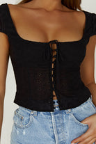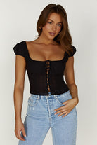 This is a puff sleeve bodycon top with a square scooped neckline, front centre closure, and lined panels for texture design. Slightly cropped and lined, it has a fitted feel to it that flatters most any silhouette. The sleeves are short, poofed, and elasticated. The front centre enclosure uses delicate buttons and ends in a loose tie string for extra detail. Lined and lightweight fabric with no padding allows for a soft, comfortable fit overall. Pair this with MESHKI Denim to elevate your look.