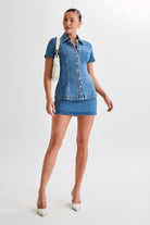 Explore the versatility of the ELLIE Denim Short Sleeve Top, a chic addition to your wardrobe. With its button front and collared neckline, this top exudes classic charm with a modern twist. The short sleeves and slim fit offer a flattering silhouette suitable for any occasion. Unlined for lightweight comfort, it ensures effortless style and ease of wear. Elevate your ensemble with the Ellie Denim Short Sleeve Top, where timeless sophistication meets contemporary flair. Pair with the Ellie Denim Mini Skirt for a complete look.