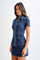 Explore the versatility of the ELLIE Denim Short Sleeve Top, a chic addition to your wardrobe. With its button front and collared neckline, this top exudes classic charm with a modern twist. The short sleeves and slim fit offer a flattering silhouette suitable for any occasion. Unlined for lightweight comfort, it ensures effortless style and ease of wear. Elevate your ensemble with the Ellie Denim Short Sleeve Top, where timeless sophistication meets contemporary flair. Pair with the Ellie Denim Mini Skirt for a complete look.