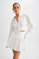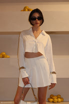 Introducing the JULIANNA Cotton Button Up Shirt in Navy, a versatile staple for every wardrobe. With its collared neckline and functional center front placket with button closure, this shirt exudes timeless sophistication. The cropped length adds a modern twist, while long sleeves and functional cuffs offer both style and practicality. Crafted from breathable, unlined cotton, it ensures comfort all day long. Complete with a back inverted box pleat and back yoke details, this shirt combines classic elements with contemporary flair. Whether dressed up the Julianna Cotton Pleated Mini Skirt or dressed down with jeans, the Julianna Cotton Button Up Shirt is a versatile piece that effortlessly elevates any outfit.