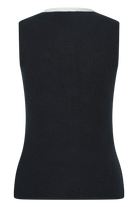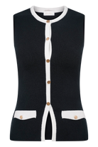 Upgrade your wardrobe with the JULIANNE Contrast Knit Top, a modern staple that combines elegance and ease. This sleeveless design features a button-front closure adorned with luxe gold buttons, complemented by a contrast neckline and center-front closure for a striking finish. Non-functional contrast pockets add a tailored touch, enhancing its sophisticated appeal. Crafted from soft knit fabric, it’s both comfortable and polished. Pair it effortlessly with the Julianne Contrast Knit Shorts for a coordinated look that’s perfect for brunch dates, city strolls, or any stylish outing.