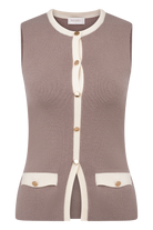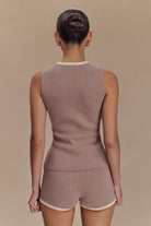 Upgrade your wardrobe with the JULIANNE Contrast Knit Top, a modern staple that combines elegance and ease. This sleeveless design features a button-front closure adorned with luxe gold buttons, complemented by a contrast neckline and center-front closure for a striking finish. Non-functional contrast pockets add a tailored touch, enhancing its sophisticated appeal. Crafted from soft knit fabric, it’s both comfortable and polished. Pair it effortlessly with the Julianne Contrast Knit Shorts for a coordinated look that’s perfect for brunch dates, city strolls, or any stylish outing.