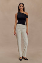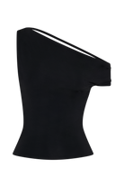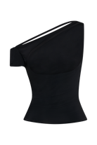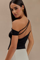 The KACEY Slinky Off Shoulder Top exudes modern elegance with its asymmetrical neckline and low scoop open back, featuring distinctive back strap detailing. Crafted from stretch fabrication, this top offers a comfortable, form-fitting silhouette and is lined for a smooth finish. The longline length adds a contemporary touch, making it perfect for pairing with jeans for a chic, effortlessly stylish look.