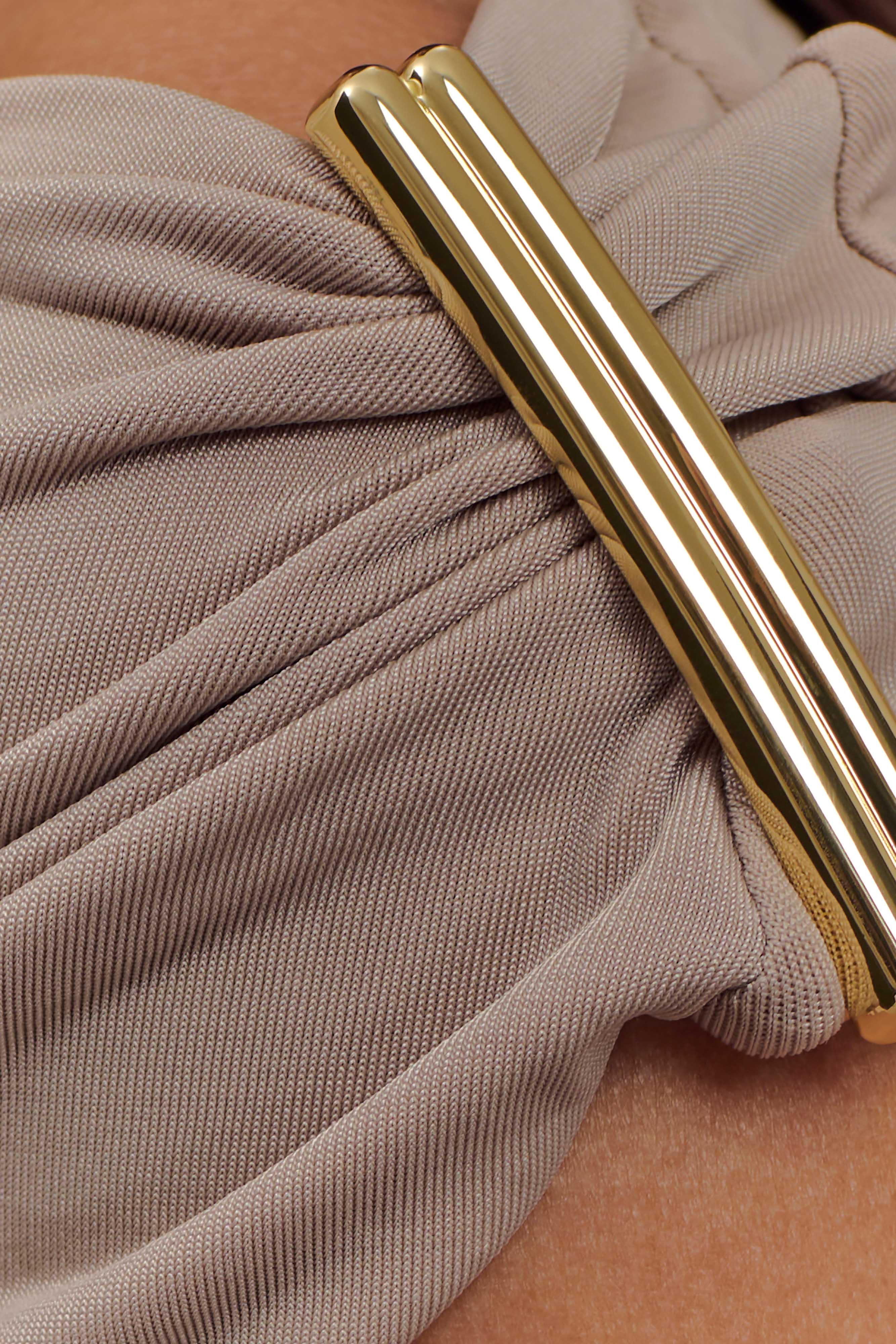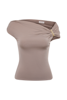Turn up the drama in the KINSLEY Slinky Top with Hardware, a figure-hugging silhouette designed to stand out. Featuring an asymmetrical neckline with gathered shoulder seams, this top is elevated with gold hardware detailing for a polished finish. Fully lined for a smooth, supportive fit, this top is the perfect blend of elegance and edge. Pair with the Caitlin Mid Rise Denim Flare Jeans for a sleek, balanced look that’s effortlessly put together.