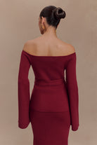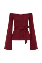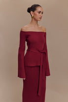 Embrace effortless elegance with the KYLE Off Shoulder Knit Top, a chic and versatile addition to your wardrobe. Featuring a sophisticated Bardot neckline, this long-sleeve top highlights your shoulders for a timeless, feminine silhouette. The flared sleeve hems add a playful touch, while the longline design and waist tie create a flattering, cinched fit. Crafted from soft knit fabric and left unlined for a lightweight feel, this top is perfect to pair with the Kyle Knit Maxi Skirt.