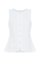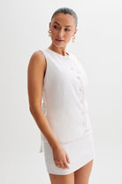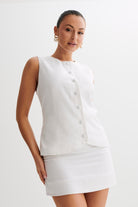 The LAURENCE is a linen top cut with a sleeveless design and a shaped hem to flatter your form. Complete with a vintage-inspired centre front button closure, the back functional belt allows you to cinch the waist for a customised fit, while gold hardware detailing adds a touch of opulence. Tailored to a longline length, it offers versatility in styling, allowing you to pair it with your favourite trousers or skirts for a polished look that's perfect for any occasion. Match with the Adrina Straight Leg Linen Pants to complete the look.