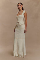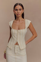 Sculpted and statement-making, the LORETTA Cap Sleeve Denim Top brings a fresh edge to everyday dressing. Featuring a structured square neckline and cap sleeves, this longline silhouette flatters with its flared hem and sculpted panel seams. A centre front opening with hook-and-eye closures adds a touch of vintage charm, while the structured denim fabrication holds its shape beautifully. Pair with the Loretta Denim Maxi Skirt for a coordinated look that redefines modern denim.