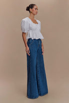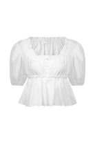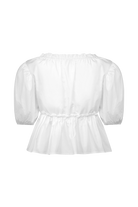 The MAGDALENA Puff Crop Top is the perfect balance of playful and elegant. Featuring a flattering round neckline with an adjustable tie for a customizable fit, this top offers both style and comfort. The blouson sleeves add a soft, romantic touch, while the peplum hem creates a feminine silhouette that flares beautifully. An elastic underbust ensures a snug, flattering fit, and the button front adds a touch of sophistication. Whether paired with high-waisted jeans or a skirt, this top is a versatile piece that exudes charm and effortless style.