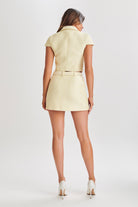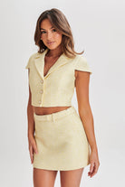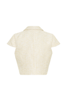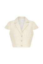 The MERCER Tweed Top boasts a V neckline complemented by a collar and lapel, offering a blend of classic sophistication and modern flair. Lined for comfort, it ensures a smooth and flattering silhouette. Featuring a button front and cap sleeves, it adds refinement to your ensemble, while the cropped length lends a chic and contemporary touch.