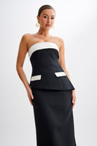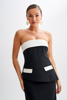 Discover the MICAH Contrast Suiting Strapless Top, where sophistication meets modern flair. With its strapless design, this top exudes timeless elegance. The contrast overlay detail and mock pocket flaps add a contemporary twist to the classic silhouette. Featuring an asymmetrical hem and structured bodice, it offers a flattering fit with a touch of drama. Complete with a side zipper for easy wear, the Micah Contrast Suiting Strapless Top is perfect for elevating any outfit, whether paired with trousers for a chic office look or the matching Micah Suiting Maxi Skirt, for a night out on the town.