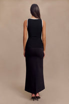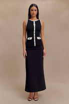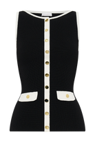 The SAWYER Longline Top is a stylish and versatile piece that brings a touch of elegance to any wardrobe. This sleeveless top features a classic round neckline and a center front button closure adorned with gold buttons, adding a luxe detail to the design. The front mock pockets enhance its sophisticated look, while the unlined knit fabrication ensures a comfortable and breathable fit. Perfect for layering or wearing on its own, the Sawyer Longline Top is a chic addition to your everyday style.