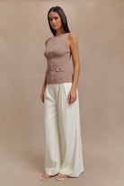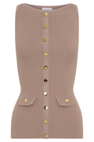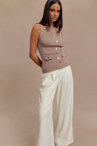 The SAWYER Longline Top is a stylish and versatile piece that brings a touch of elegance to any wardrobe. This sleeveless top features a classic round neckline and a center front button closure adorned with gold buttons, adding a luxe detail to the design. The front mock pockets enhance its sophisticated look, while the unlined knit fabrication ensures a comfortable and breathable fit. Perfect for layering or wearing on its own, the Sawyer Longline Top is a chic addition to your everyday style.