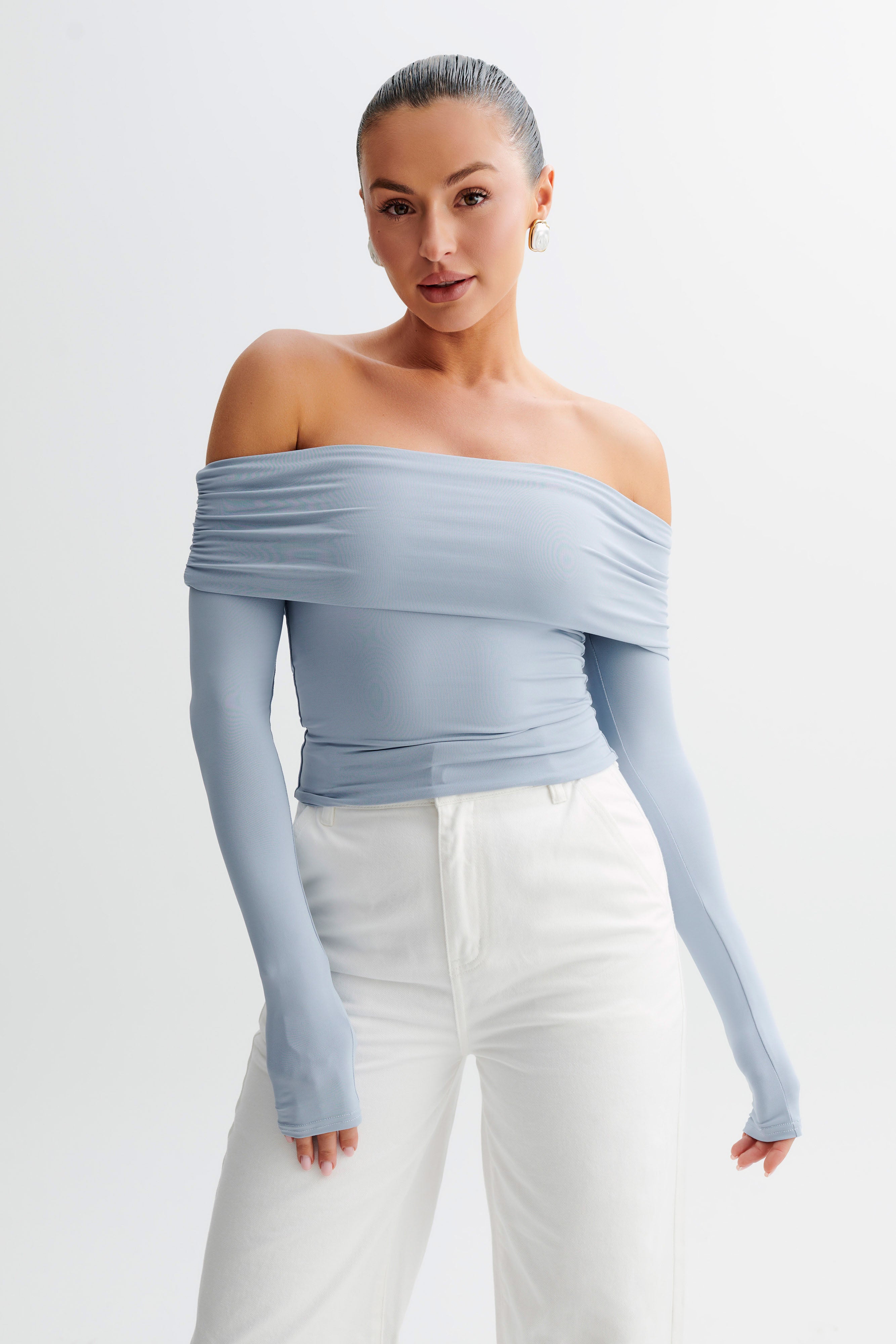 Lucinda Recycled Nylon Off Shoulder Top - Dusty Blue