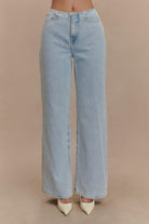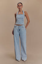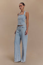 The CAITLIN Mid Rise Denim Flare Jeans offer a modern take on classic denim, designed for both style and comfort. With a flattering mid-rise waist and a sleek, straight-leg fit, these jeans elongate the legs while maintaining a relaxed silhouette. The fly front closure ensures a secure fit, while the front and back pockets add both functionality and detail. Finished with a waistband-less design for a smooth, contemporary feel, these jeans are perfect for elevating your everyday casual look. Pair with the Dayna Denim Halter Top for a complete, effortlessly chic ensemble.