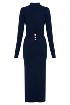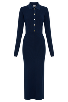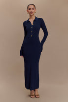 The ABBEY Buttoned Knit Maxi Dress is a stylish blend of sophistication and comfort. With a classic collared neckline and button front closure, this dress exudes timeless charm. The blouson bodice creates a relaxed fit, while the cinched waist detail highlights your shape for a flattering silhouette. The long sleeves with sleeve hem cuffs add a refined touch, and the straight skirt offers a sleek, streamlined look. Crafted from ribbed knit fabrication, the dress provides just the right amount of stretch and warmth. With a maxi length, this dress is perfect for effortlessly elevating your wardrobe for any occasion.