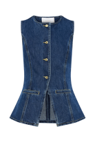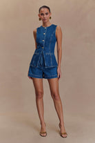 Presenting the ABEL Denim Button Up Top, a modern essential for your wardrobe rotation. Boasting a round neckline and a convenient centre front button closure, this sleeveless denim button up top offers a versatile and chic aesthetic. The addition of front mock pockets adds a hint of utilitarian flair, while princess seams ensure a flattering silhouette. This longline vest is perfect for layering over various outfits, whether you're going for a relaxed weekend look with the Abel Denim Shorts or adding a touch of sophistication by layering it over a dress. Versatile and stylish, the Abel Denim Button Up Top is destined to become a key piece in your wardrobe lineup.