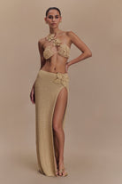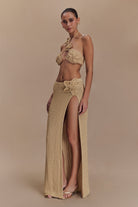 The ABIGAIL Floral Crochet Maxi Skirt is the epitome of bohemian elegance, crafted from intricate crochet fabrication for a textured finish. Designed with a statement floral accent at the hip and a daring side cut, this skirt offers a perfect blend of femininity and allure. The elastic waist ensures a comfortable, flattering fit, while the maxi length enhances its flowing, graceful silhouette. Pair it with your favourite top or matching River Floral Crochet Bikini Top for a chic, carefree look that’s perfect for sunny days and dreamy nights.