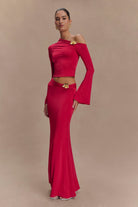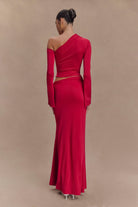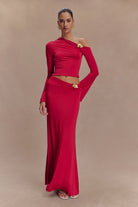 Elevate your style with the AINSLEY Asymmetrical Maxi Skirt, a stunning blend of elegance and contemporary flair. This skirt features a striking asymmetrical waistline that adds an unexpected twist to your look, while the flattering fishtail hem shape creates a graceful silhouette with every step. Fully lined for comfort and coverage, the maxi length offers a sophisticated vibe perfect for any occasion. Adorned with exquisite floral hardware at the hip, this skirt is a statement piece that embodies both artistry and grace. Pair it with the Ainsley Asymmetrical Long Sleeve Top With Floral Hardware for a polished ensemble that captures attention effortlessly.