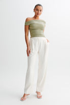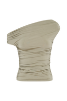 ALAYNA is an asymmetrical top with a straight-cut neckline and strategic ruching. Sewn from a custom blend of elastane and recycled nylon, its stretchy fabrication offers a fairly bodycon fit that highlights your curves. The ruching around the waist and arms further shapes and elongates the body, creating a universally flattering silhouette. Fresh and unique, this seasonal must-have can be worn as a solo feature or layered with a textured blazer.