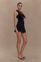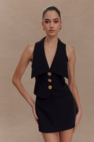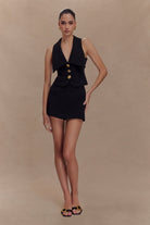 Redefine sophistication with the ALIX Mixed Button Vest, a modern essential for your wardrobe. Designed with a sleek V front and a button-up closure, this sleeveless vest is elevated by an oversized collar for a bold yet refined look. Custom decorative buttons add a unique touch, making it a standout piece. Pair effortlessly with the Alix Suiting Mini Skort for a coordinated ensemble that blends elegance and versatility, perfect for any occasion.