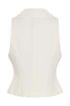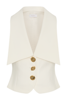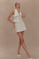 Redefine sophistication with the ALIX Mixed Button Vest, a modern essential for your wardrobe. Designed with a sleek V front and a button-up closure, this sleeveless vest is elevated by an oversized collar for a bold yet refined look. Custom decorative buttons add a unique touch, making it a standout piece. Pair effortlessly with the Alix Suiting Mini Skort for a coordinated ensemble that blends elegance and versatility, perfect for any occasion.