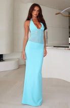 Create the dreamiest look in the All My Love - Maxi Dress! Features a halter neck design with hook and loop closure, low plunge sweetheart neckline, sheer bodice with ruching detailing, maxi length, backless, back split detailing, and stretch material.